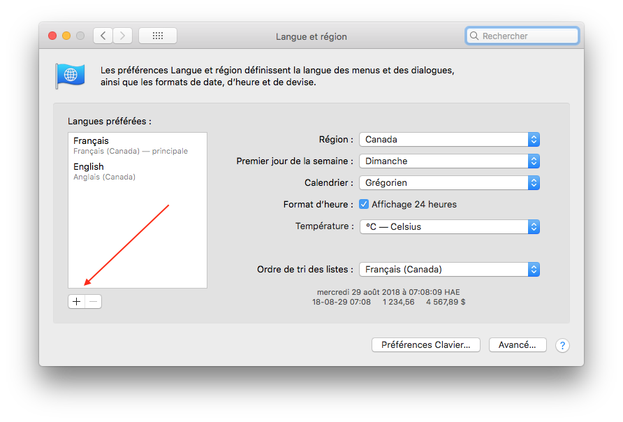 Si votre langue n'apparaît pas, cliquer sur le + et choisir votre langue et la placer en haut.