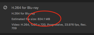 A droite il ya les info de la video en elle meme. En haut a droite, la taille estimee du ficher rendu, en l'ocurrence 824 Mo. (oui je sais ce n'est pas tes 27,6 Go...mais attends....