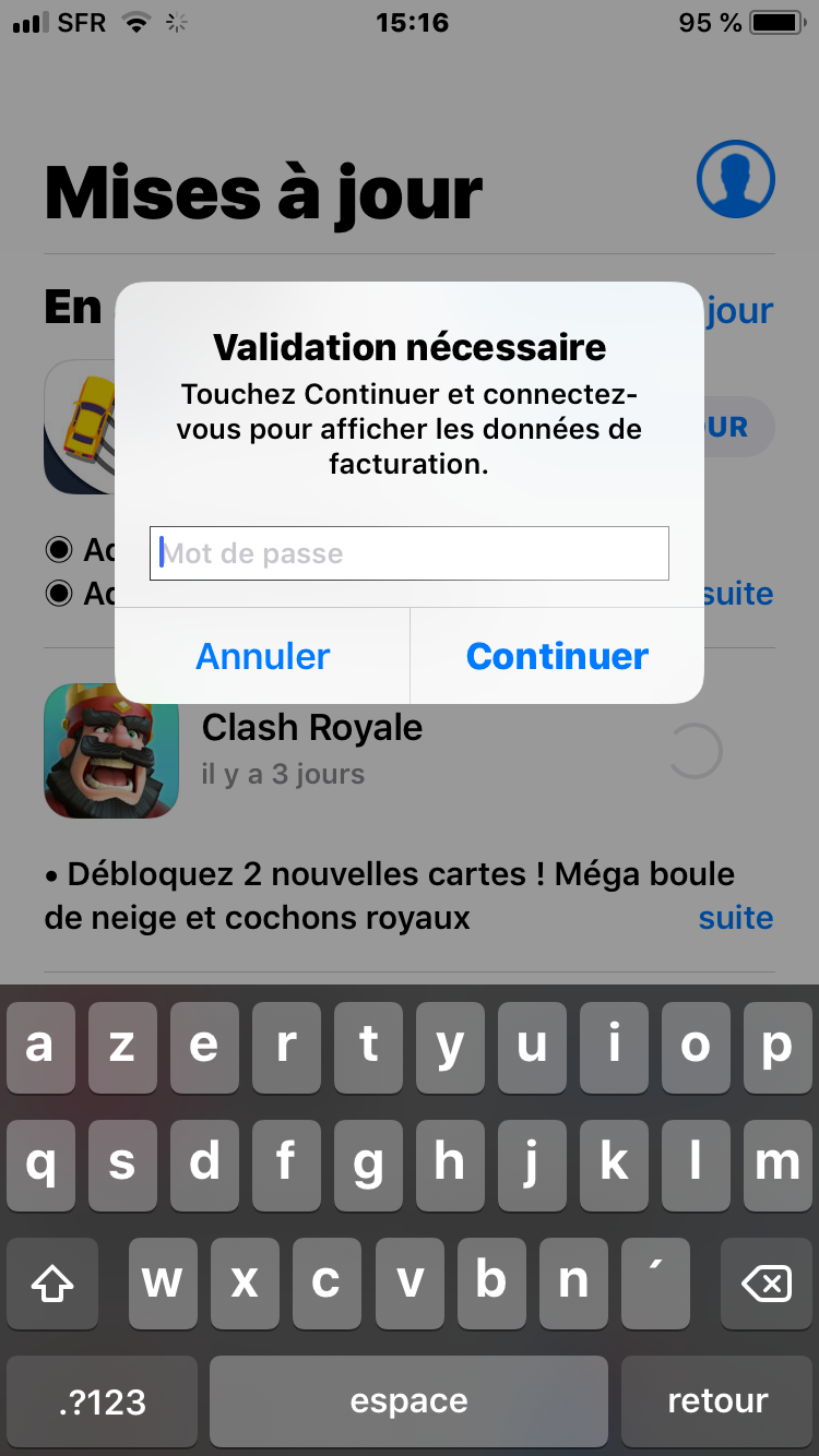 une fois que le message ’’validation nécessaire ‘’ c’est affiché je rentre mon mot de passe j’ai déjà sélectionné dans les parametre de mon iphone aucun mode de paiment je met terminer et le message ‘’validatiok necessaire’’ revient et cela depuis 2 semaines