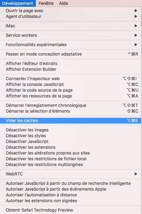 - Dans le menu Safari, choisi Développement et sélectionne Vider les caches dans ce menu.