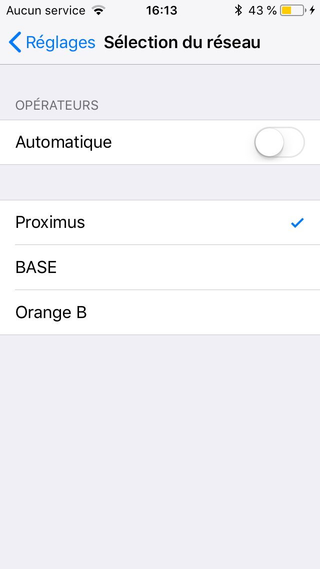 Je suis arrivée il y a maintenant une semaine à Bruxelles pour faire mes études et mon téléphone m'indique que je n'ai aucun service. L'option Sfr Voyage est bien activée, or cela ne fonctionne pas. J'ai essayé de sélectionner un réseau manuellement mais lorsque j'en choisis un mon Iphone m'indique toujours "Aucun Service". Comment puis-je faire pour régler ce problème ?
