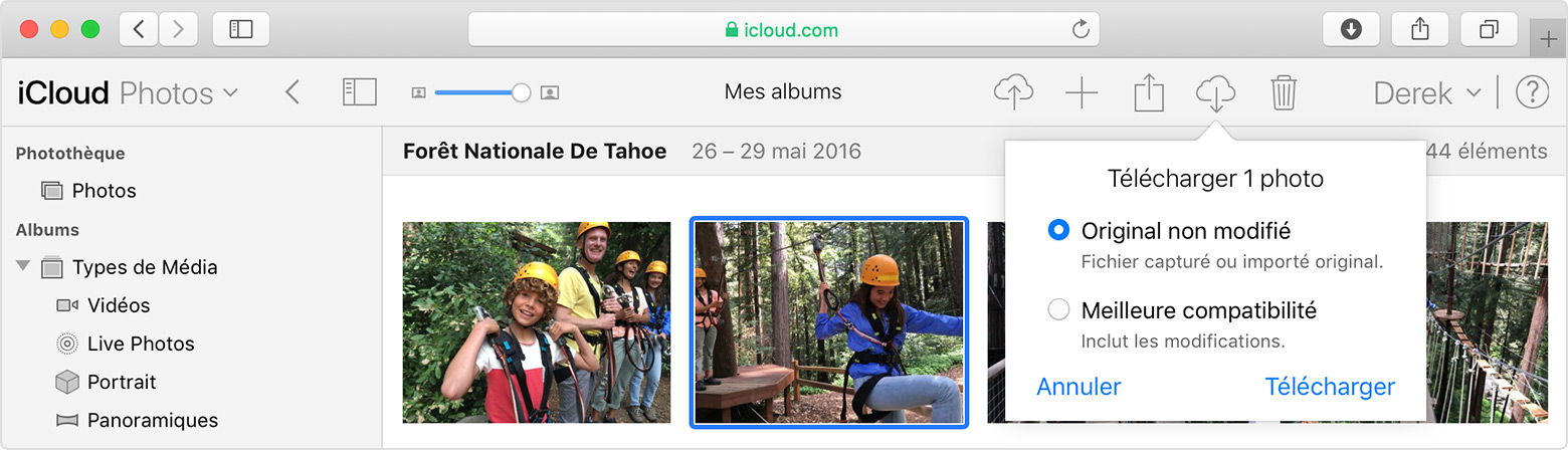 dans l’angle supérieur droit de la fenêtre. Si vous souhaitez télécharger votre contenu tel qu’il a été initialement enregistré ou importé, choisissez Original non modifié. Concernant le format JPEG ou H.264, y compris les modifications, sélectionnez Les plus compatibles, même si le contenu était à l’origine au format HEIF ou HEVC. Cliquez sur Télécharger.