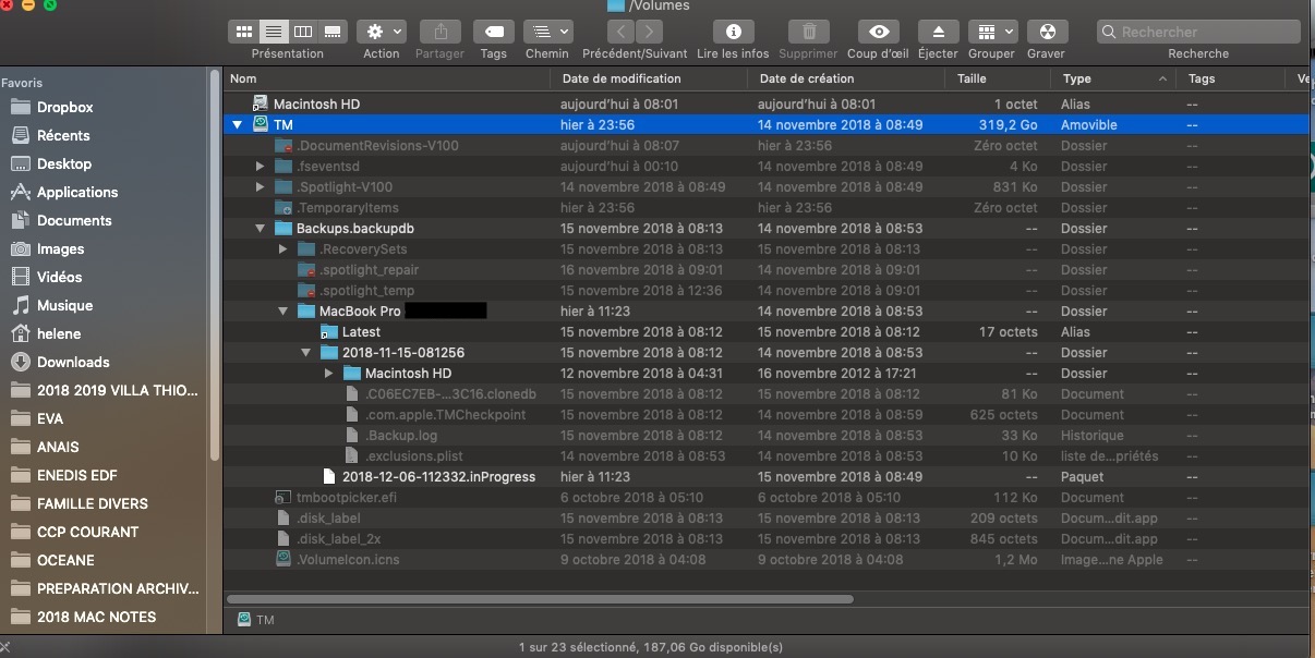 Je mets "ignorer la sauvegarde" les snapshots apparaissent : Volumes/com.apple.TimeMachine.localsnapshots/Backupsdb/Macbook Pro de ...2018.12.04-1......jusqu'à 13H33