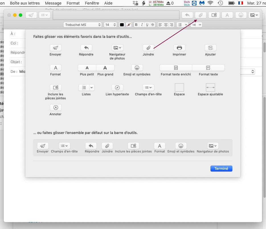 Pour le récupérer, tu ouvres un nouveau message et tu fais un clic droit dans la partie haute où se trouve la barre des menus et tu demandes Personnaliser la barre d'outils...
