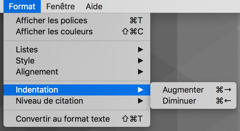 Raccourci clavier indentation dans Mail