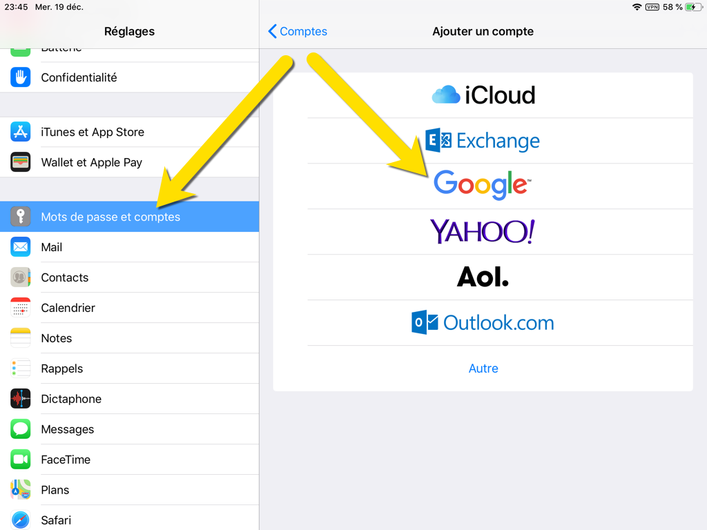 il m’était impossible d’envoyer des courriels via mon gmail depuis quelque temps. Après avoir pris connaissance de la marche à suivre sur l’aide Apple, j’ai supprimé mon compte pour le réinstaller complètement et il m’est impossible de le réinstaller. De plus j’ai perdu mes contacts, puisque je les synchronisait sur le serveur de gmail.