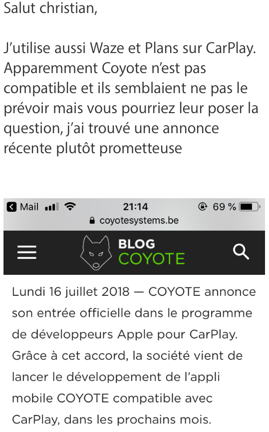 je viens de prendre possession d’un nvx véhicule Hunday tucson, la fonction CARPLAY est activé. j’ai besoin de COYOTE GPS et info trafic qui est très sur a ce jour... j’ai testé Waze mais manque pleins de radars... et radars mobile.m instantané...
