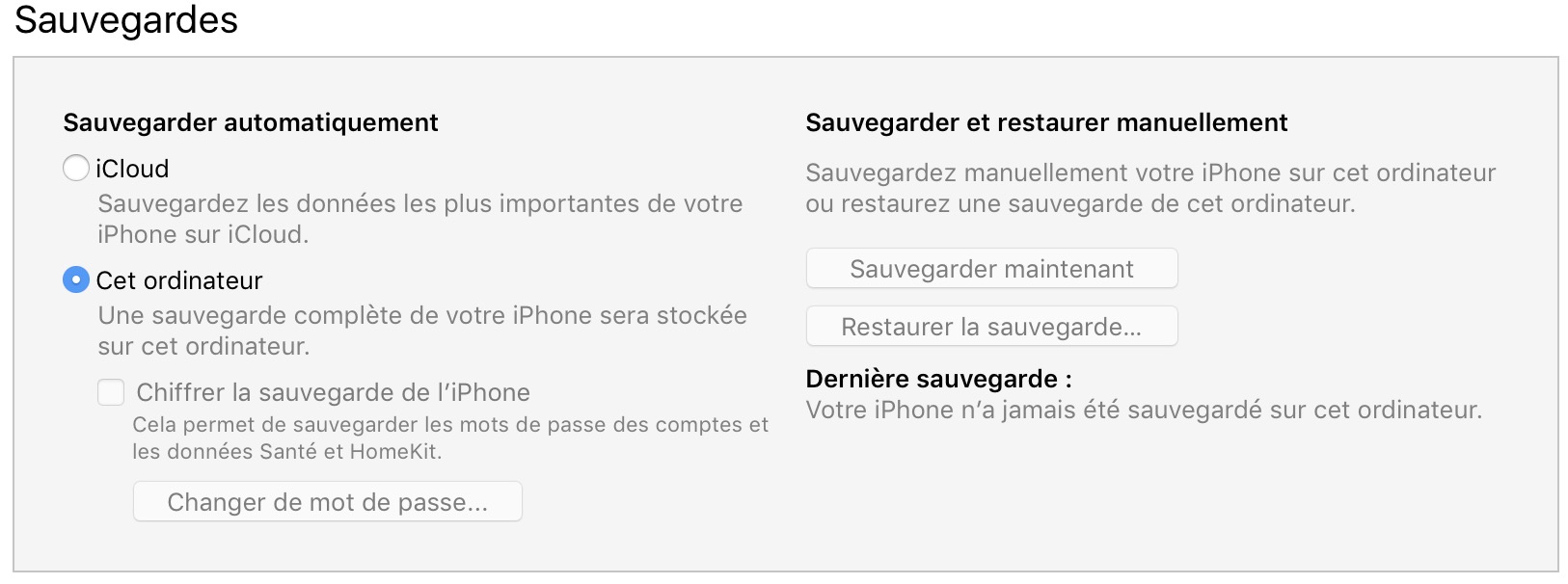 J'ouvre iTunes, je branche mon iPhone. iTunes affiche qu'aucune sauvegarde n'existe mais tout est grisé. Comment la faire cette sauvegarde ?