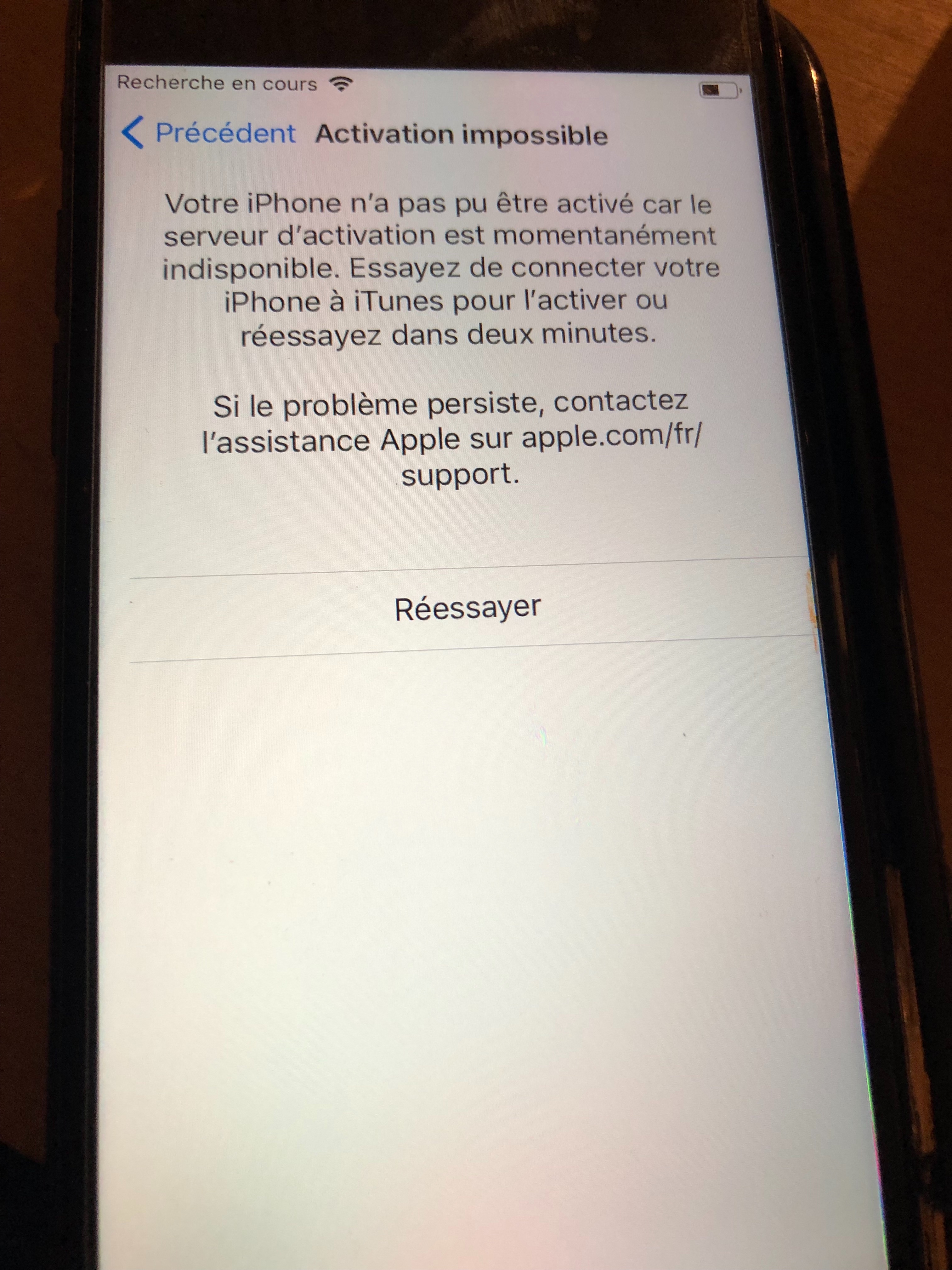 mon conjoint a un iPhone 7 128 go. Il a voulu faire la mise à jour hier de son iOS sauf que le téléphone ne trouve plus les données cellulaires depuis. Après avoir été sur plusieurs forums pour voir les manipulations à faire, essayé la mise en mode avion, l’allumage, reallumage du téléphone et une réinitialisation complète via iTunes. Le téléphone ne trouve toujours pas les données cellulaires et nous envoie vers le support Apple. Pourriez vous nous donner la marche à suivre ? Merci d’avance. Ci joint une photo du message d’erreur au moment de l’allumage...