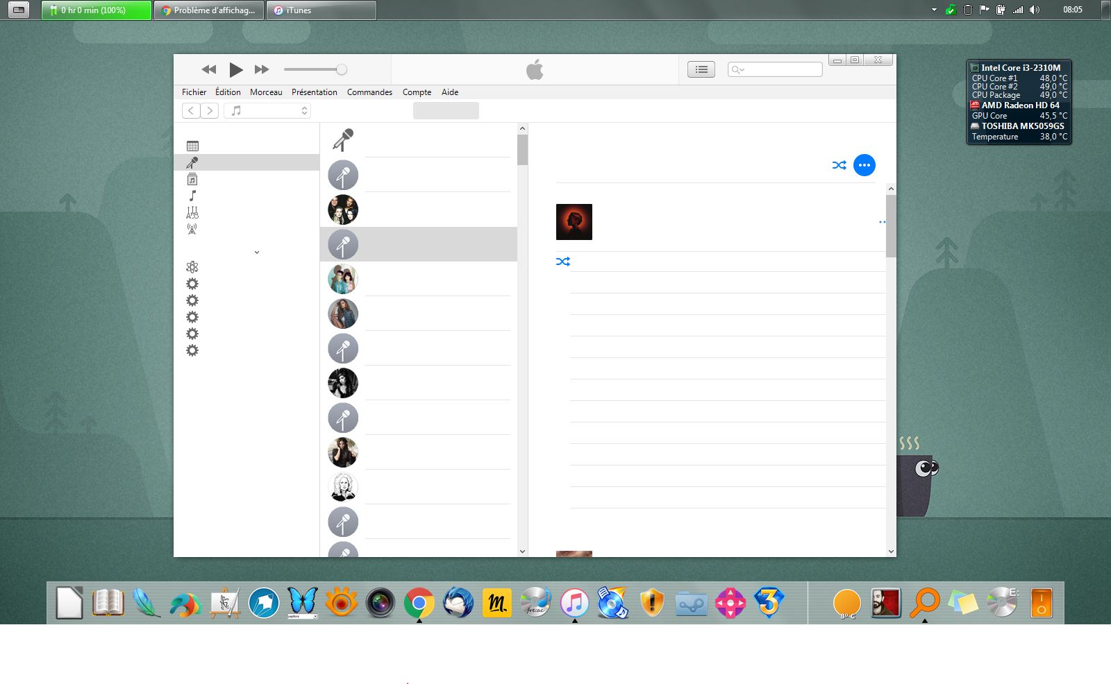 Mon portable est sous Windows 7 Ed. Familiale Premium et la toute dernière mise à jour d'iTunes (Version 12.9.4.102) est complètement foireuse. J'ai tout essayé : redémarrer l'ordinateur, désinstaller et reinstaller iTunes proprement, installer toutes les MAJ Windows disponibles... rien n'y fait. En l'état, iTunes est tout simplement inutilisable et c'est à la limite du supportable :(