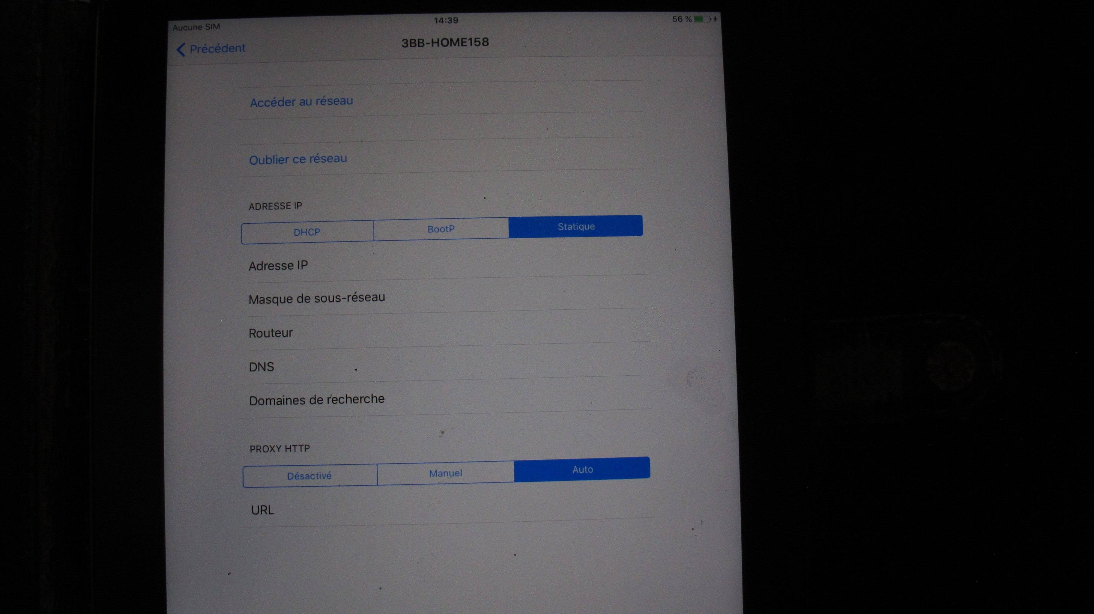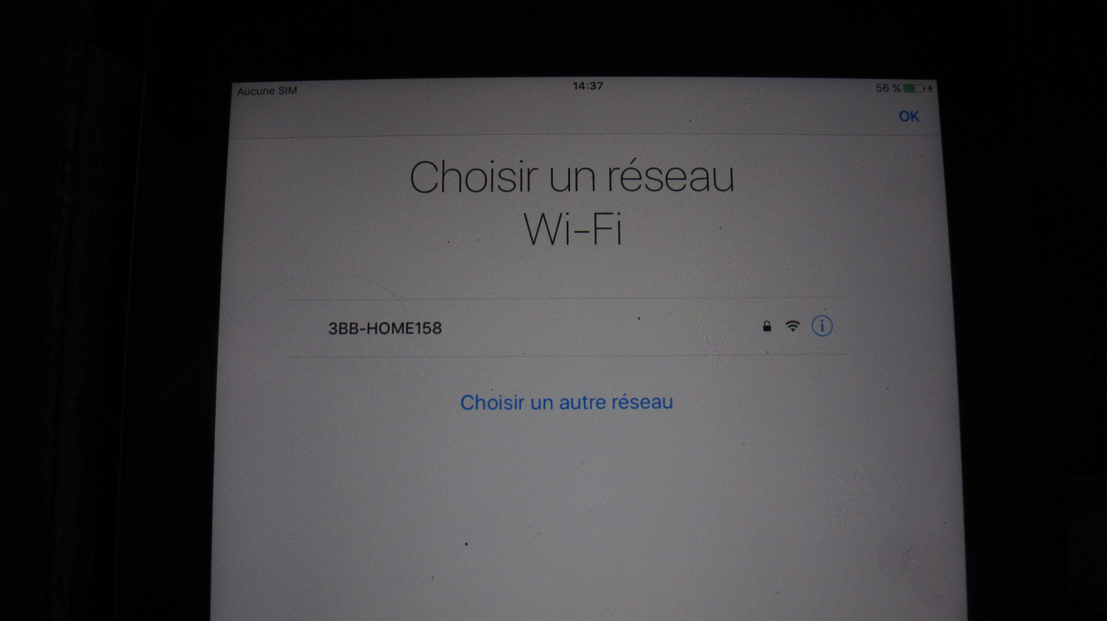 impossible de configurer mon iPad. Aucun accès aux réglages, ni à rien d'ailleurs. Affiché : "Coisissez réseau WiFi. Le mien es indiqué "3BB-HOME158" mais on me dit "Choisir une autre réseau"... Why ?