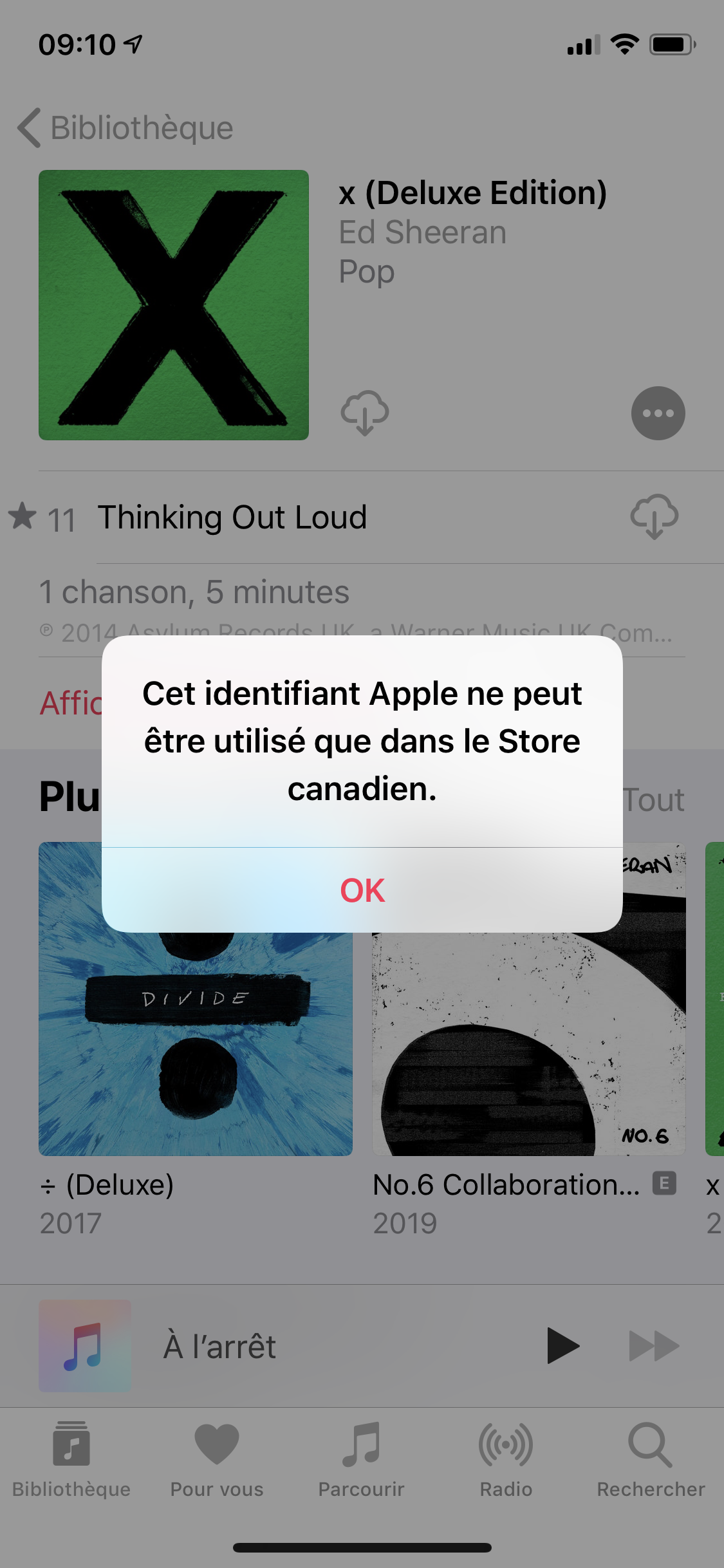 Bonjour mon ITunes Ne marche pas. En essayant de jouer la musique la musique ne démarre pas et il y’a souvent des messages disant que je ne peux pas télécharger la musique car je peut télécharger de la musique seulement canadienne. Aider moi s’il vous plaît