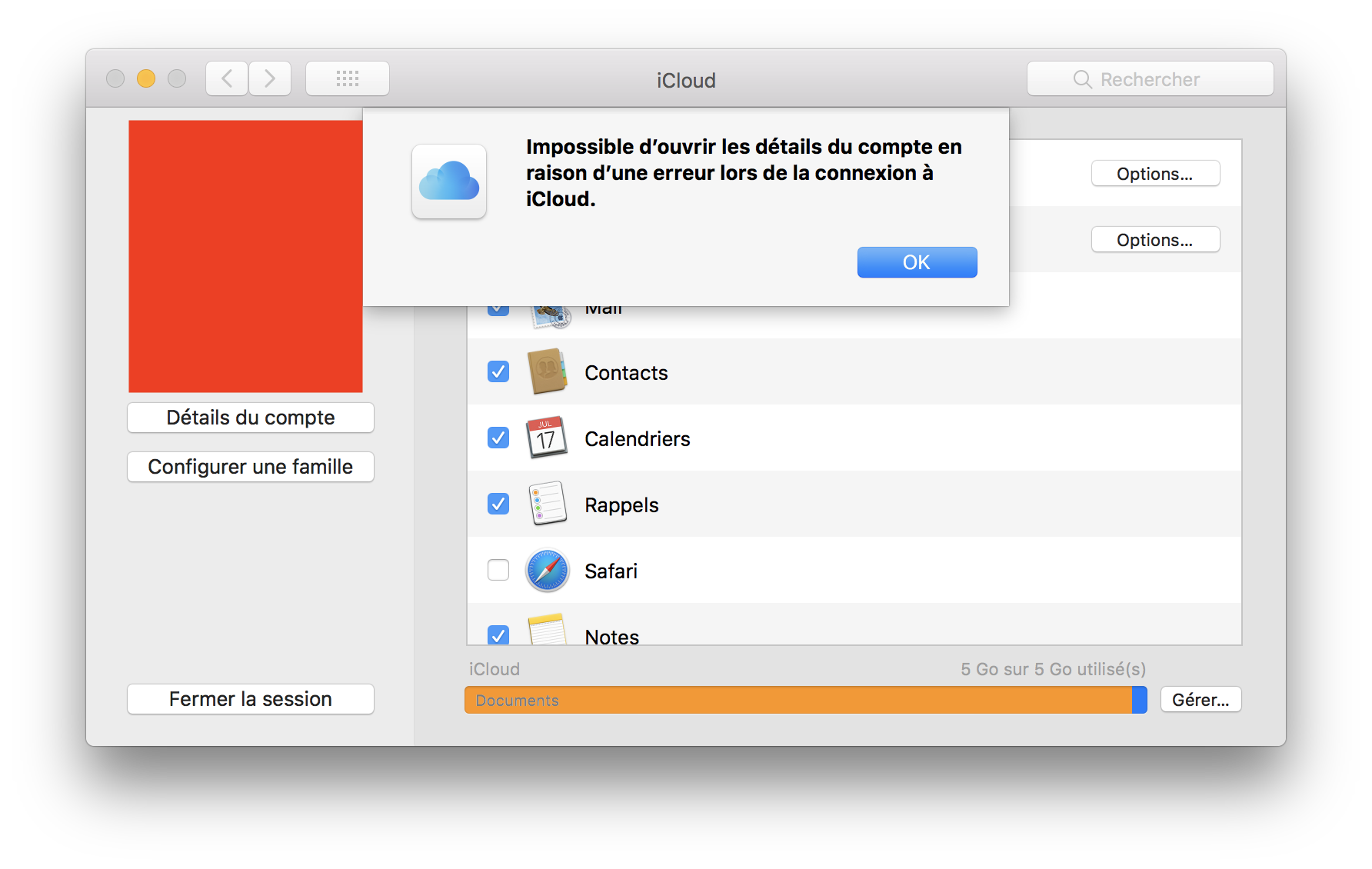 2) En fermant et rouvrant ''Préférences Système'' puis en retournant dans iCloud, le compte semble ouvert, mais en cliquant sur ''Détails du compte'', il me demande à nouveau le mot de passe, en le mettant, un nouveau message apparait disant ''Impossible d’ouvrir les détails du compte en raison d’une erreur lors de la connexion à iCloud.''