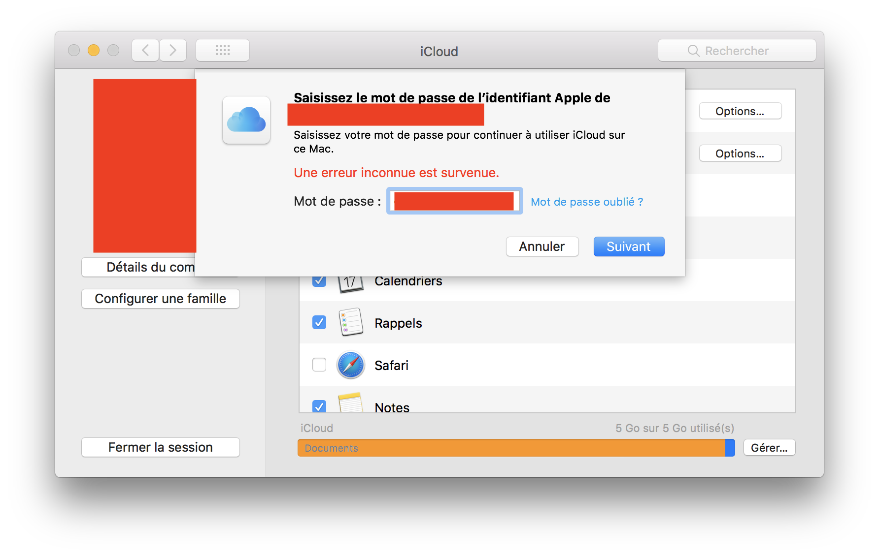 1) iCloud, dans ''Préférences Système'', me demande le mot de passe de l'identifiant Apple, en le mettant un message rouge apparaît disant ''une erreur inconnue s'est produite''