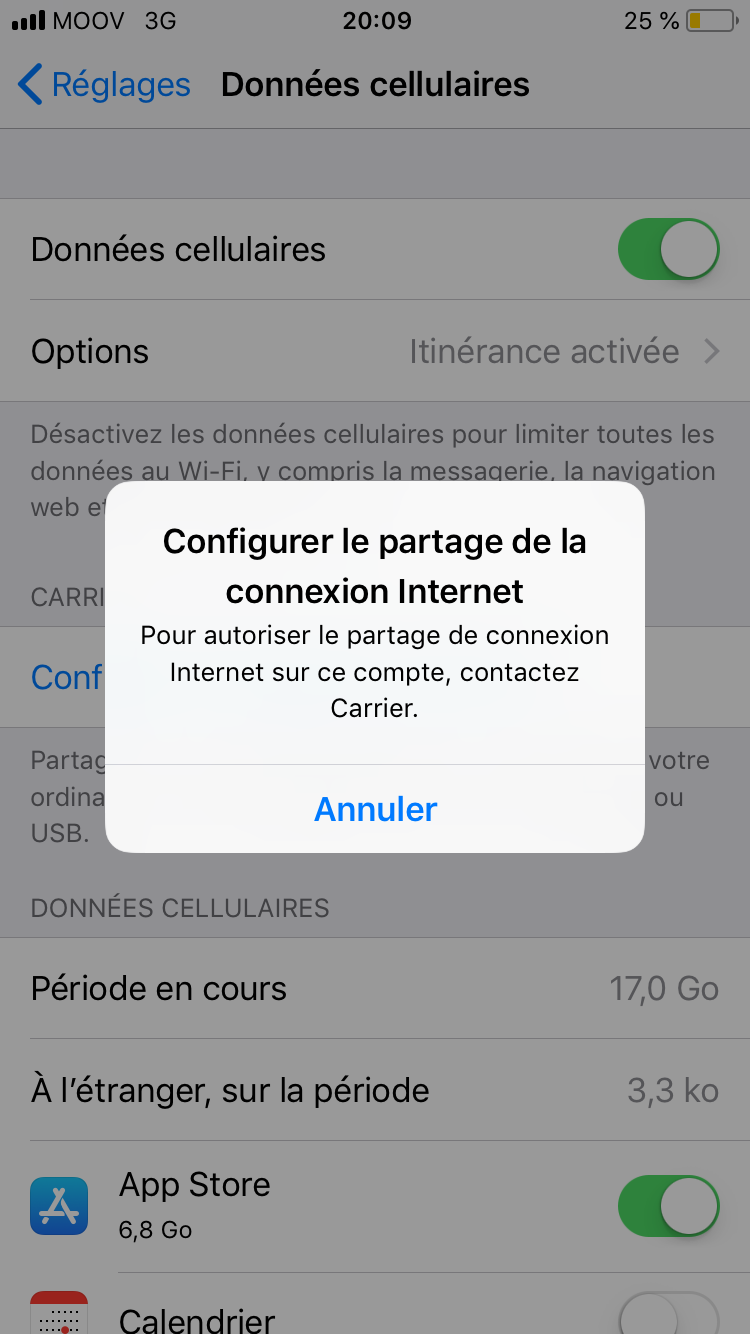 Je vous invite à contacter votre opérateur téléphonique qui peut interdire que votre téléphone portable serve de modem c'est-à-dire qu'il puisse partager sa connexion.