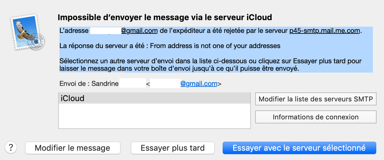 app Mail - Impossible d'envoyer le message via le serveur iCloud