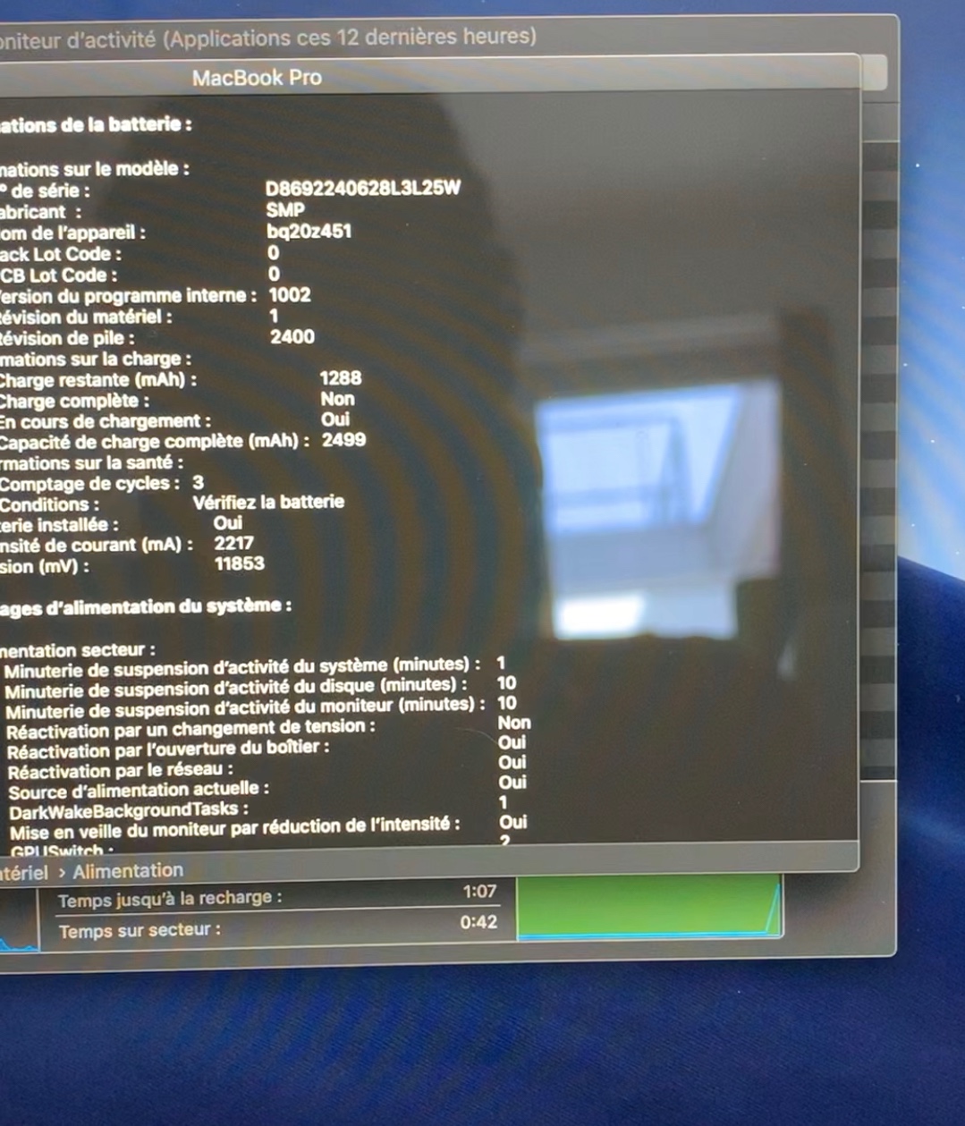 photo ci-joint montrant la capacité de charge complète de 2400 mAH alors que la batterie à 3 cycle avec le message vérifiez votre batterie.