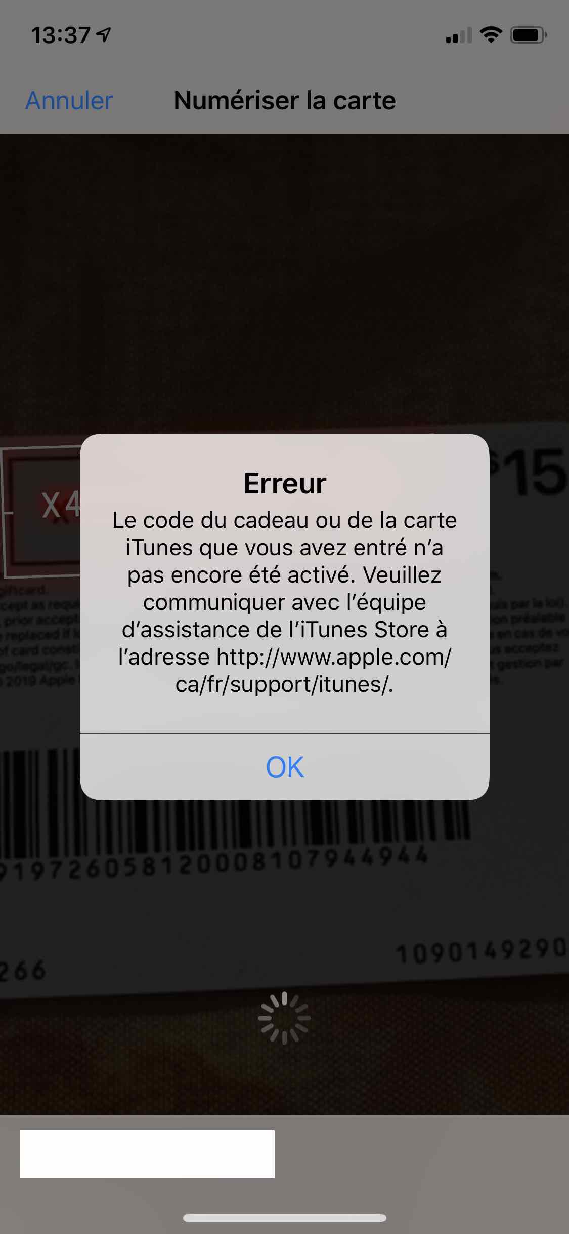 J’essaye de rentrer une carte itunes de 15$ mais ca me dit qu’elle n’est pas encore activée