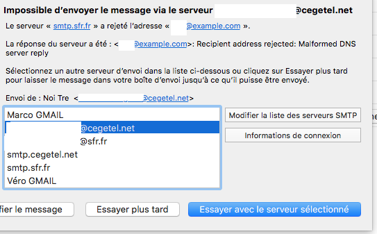 Envoi mails depuis MAIL sur iMac avec smtp.sfr.fr KO (réception fonctionne)