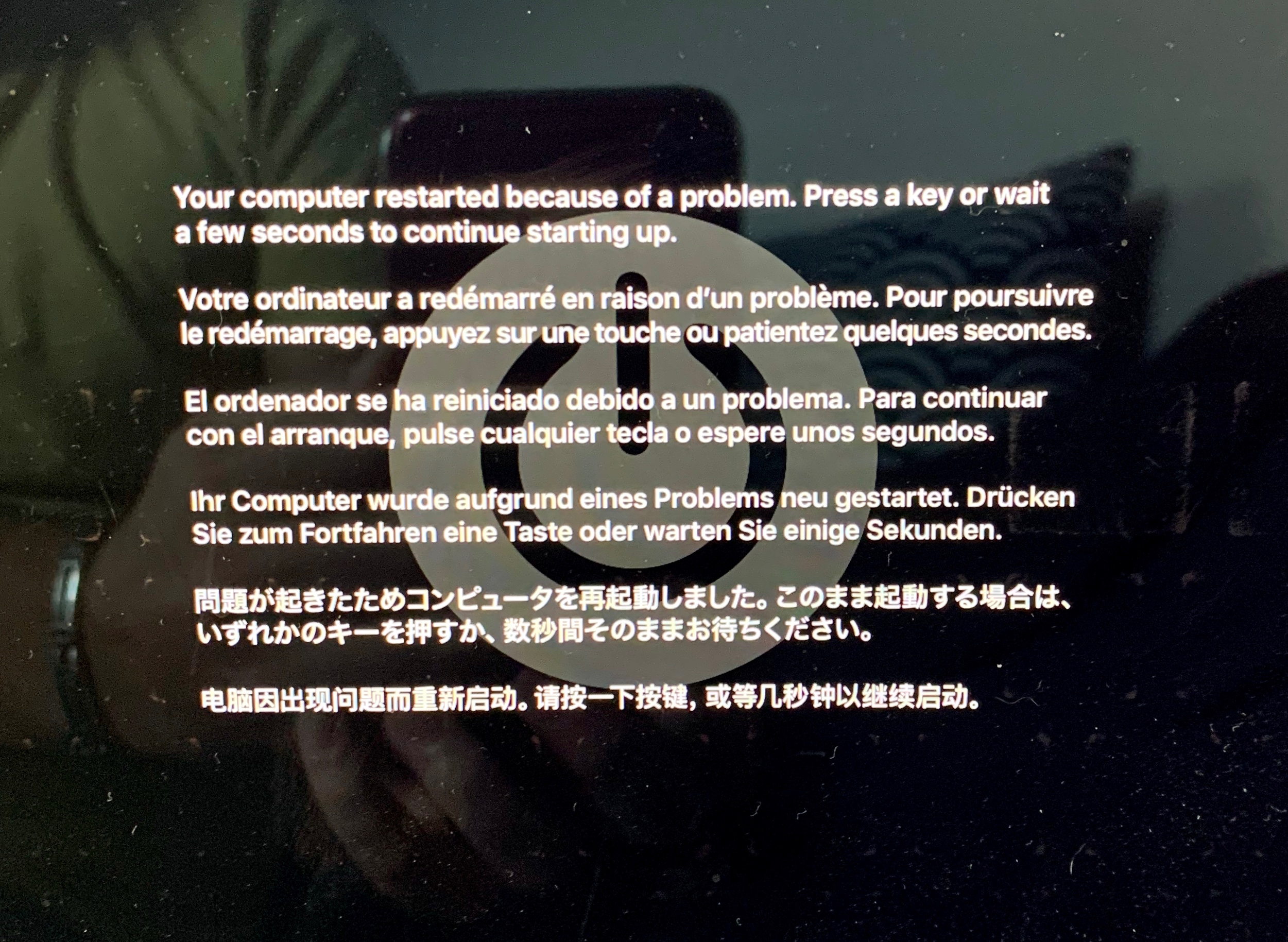 Après quelques secondes avec la pomme blanche puis une barre de chargement, l'écran s'éteint et quelques secondes je comprends qu'il redémarre...