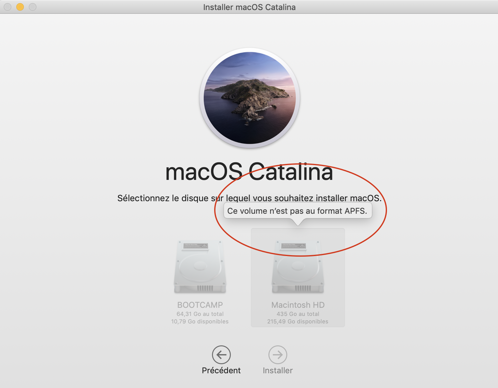 Quand je suis sur la page "installation", il me dit que mon volume n'est pas en APFS.
