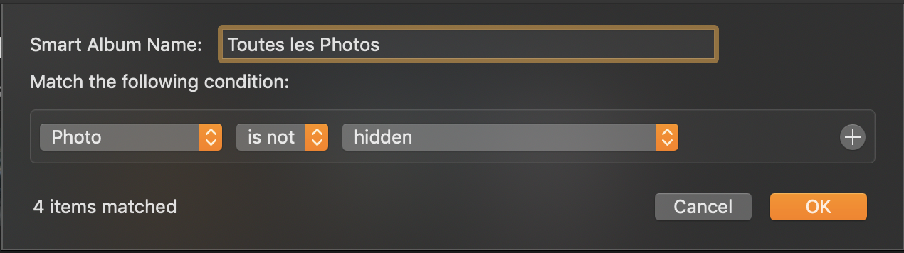 • Nomme l'album "Toutes les photos" ou le nom que tu veux. Ensuite dans les conditions : Photos > qui ne sont pas > cachées > Ok