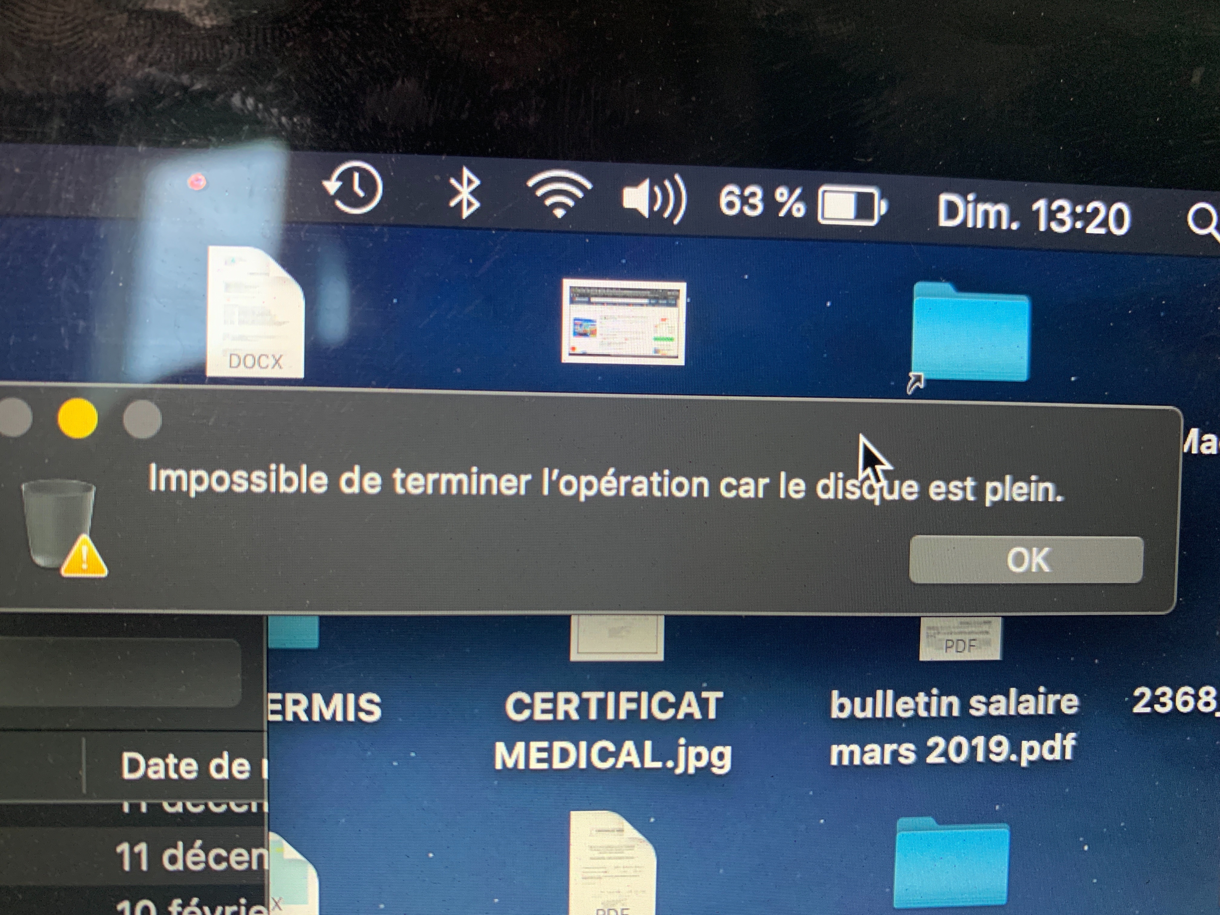 mon disque dur est totalement saturé... et impossible de supprimer quoique que ce soit! Du coup je n’ai plus accès à rien, impossible d’ouvrir un fichier ou iTunes ou même mes mails... j’ai peur de le redémarrer car il risquerait (si j’ai bien compris) de ne plus s’allumer... j’ai des documents confidentiels et importants sur ce mac.. et brancher un dde, il est détecté mais impossible d’y accéder...