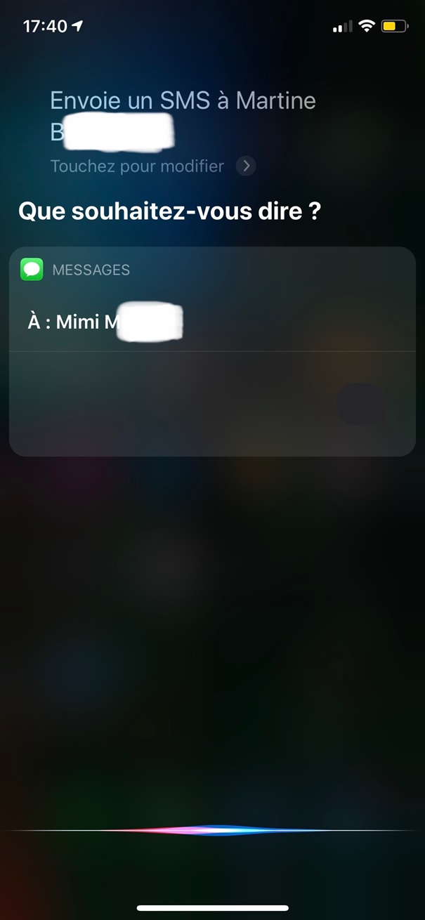 - et un autre : je dis un « prénom - nom » (ma mère) et il prépare le sms mais avec un tout autre destinataire ! Il fait cette erreur uniquement sur ce contact alors que leurs infos sont différentes. Il fait la même erreur lorsqu'il comprend mal le nom, me demande de choisir dans les contacts. Je choisis le contact de ma mère et il refait le sms à l'autre personne.