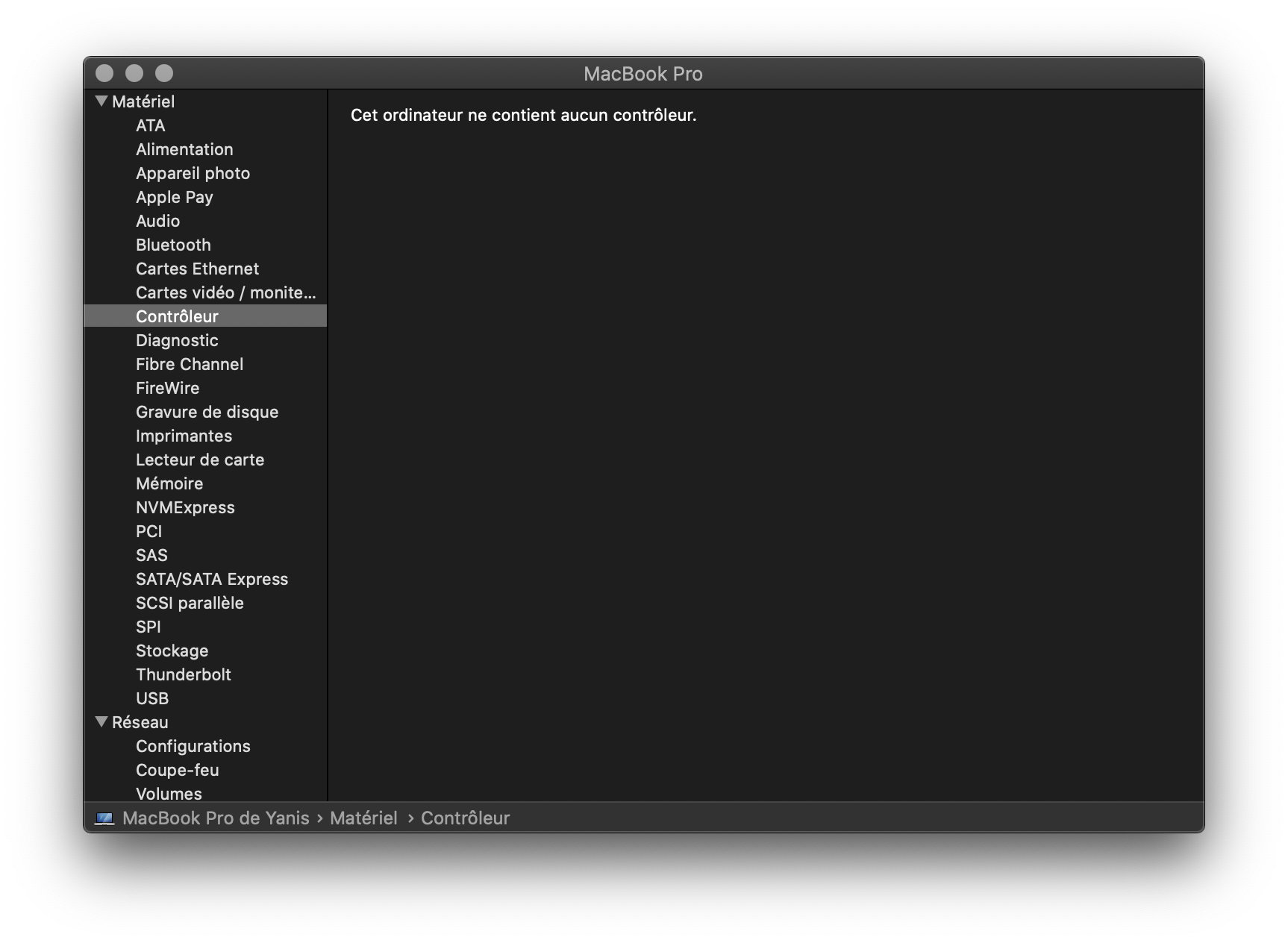 J'ai vue sur le site d'Apple que le problème pouvait être résolu en réinitialisant le SMC mais mon mac n'affiche aucun contrôleur lorsque je fait la mannip option + pomme + apropos de ce mac.