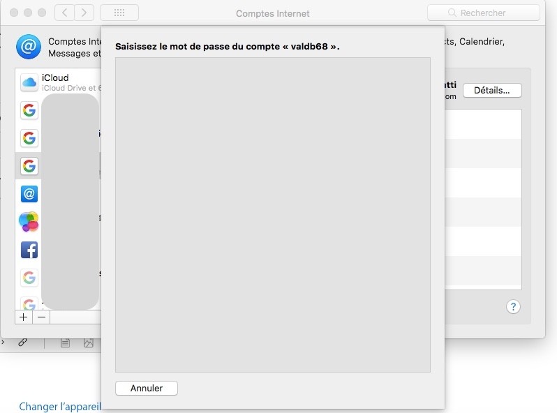 A chaque ouverture de session, Mail me redemande de saisir le mot de passe de mon compte Gmail. Ce que je fais, mais après que j'ai saisi mon mot de passe la fenêtre ne ferme pas, et je suis obligée de cliquer sur "annuler" pour que la fenêtre se ferme (cf capture d'écran). J'ai vérifié mon mot de passe sur mon compte google en ligne, c'est bien le bon... Tout marchait bien jusqu'il y a quelques jours.