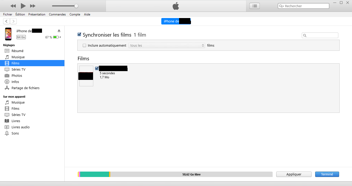 Je précise que la vidéo apparaît uniquement lorsque je connecte mon téléphone à iTunes. Le fichier ne se trouve pas dans ma bibliothèque "Films".