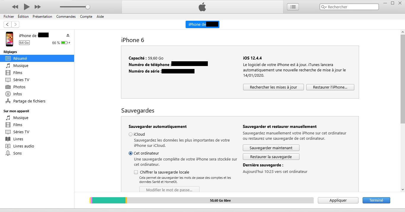 J'ai un iPhone 6 sous iOS 12.4.4 que je synchronise avec iTunes, installé sur mon ordinateur qui fonctionne sous Windows 10.