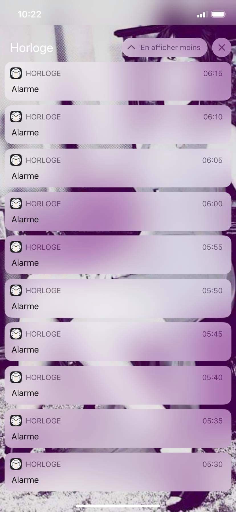 Voila les alarmes qui n’ont jamais été mises ni sur l’ancien iphone ni sur le nouveau il n’y a pas cette alarme dans les réveils mais il sonne quand même