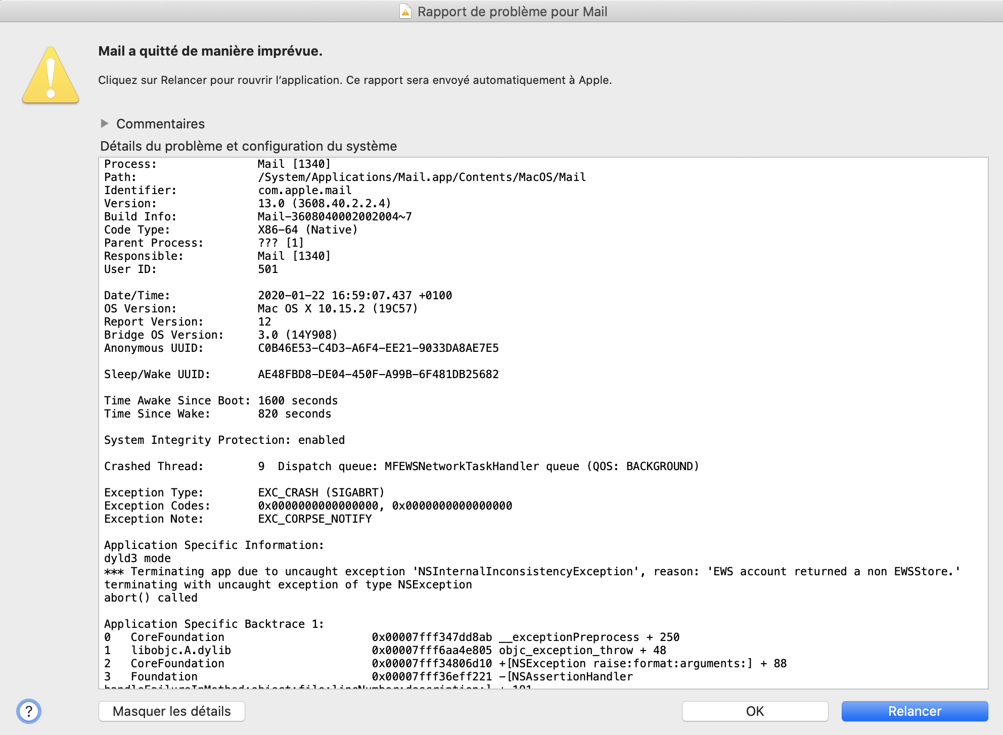 message d'erreur à l'ouverture de l'appli Mail sur mac pro ... Help
