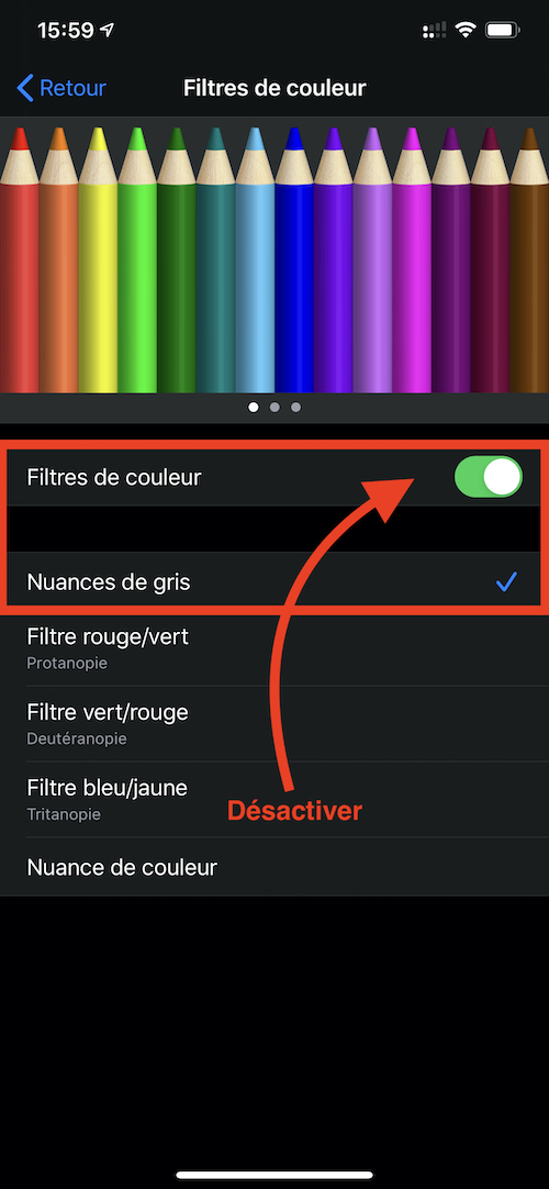 Mon iPhone X s’est mis tout seul en noir et blanc. J’essaye de le remettre en couleur. Je suis le protocole préconisé par Apple. En allant dans réglages accessibilité inverser les couleurs. Cliquer 3 × 1 bouton latéral. Cela ne marche pas. Quelqu’un a-t-il une solution ?