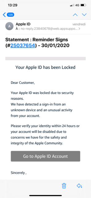 J ai reçu un mail qui m’annonce que mon apple id sera bloqué si je confirme pas mon compte dans les 12h, j’ai un doute sur le mail en question , est ce que quelqu’ un a eu ce genre de situation??? merci