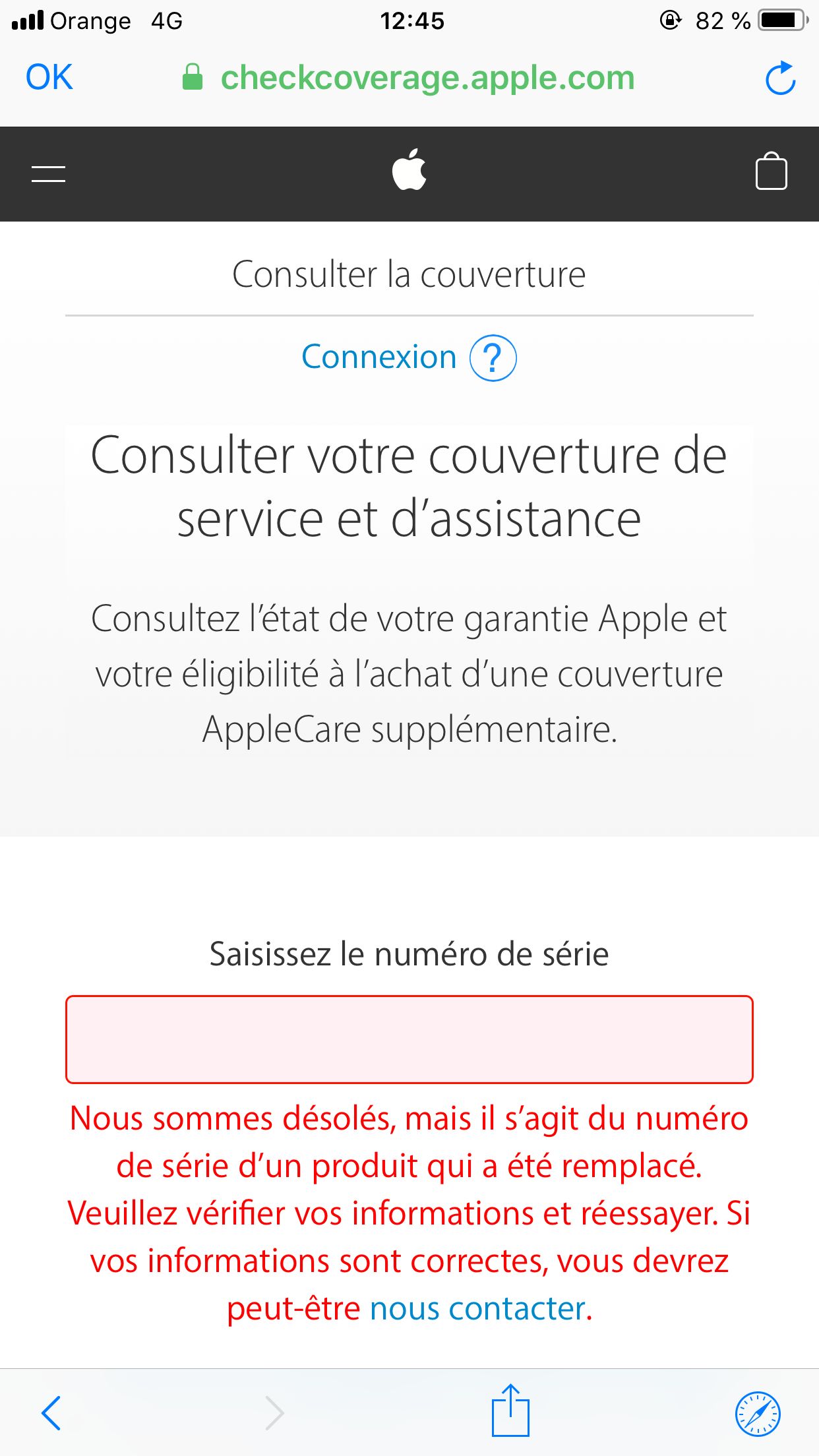 Salut.j’ai un iPhone 6 Plus et mon problème est que lorsque je fais entrer le numéro de série sur la page d’apple pour vérifier la couverture.On me répond ceci:<<Desolé,ce numéro est le numéro de série d’un produit qui a été remplacé.