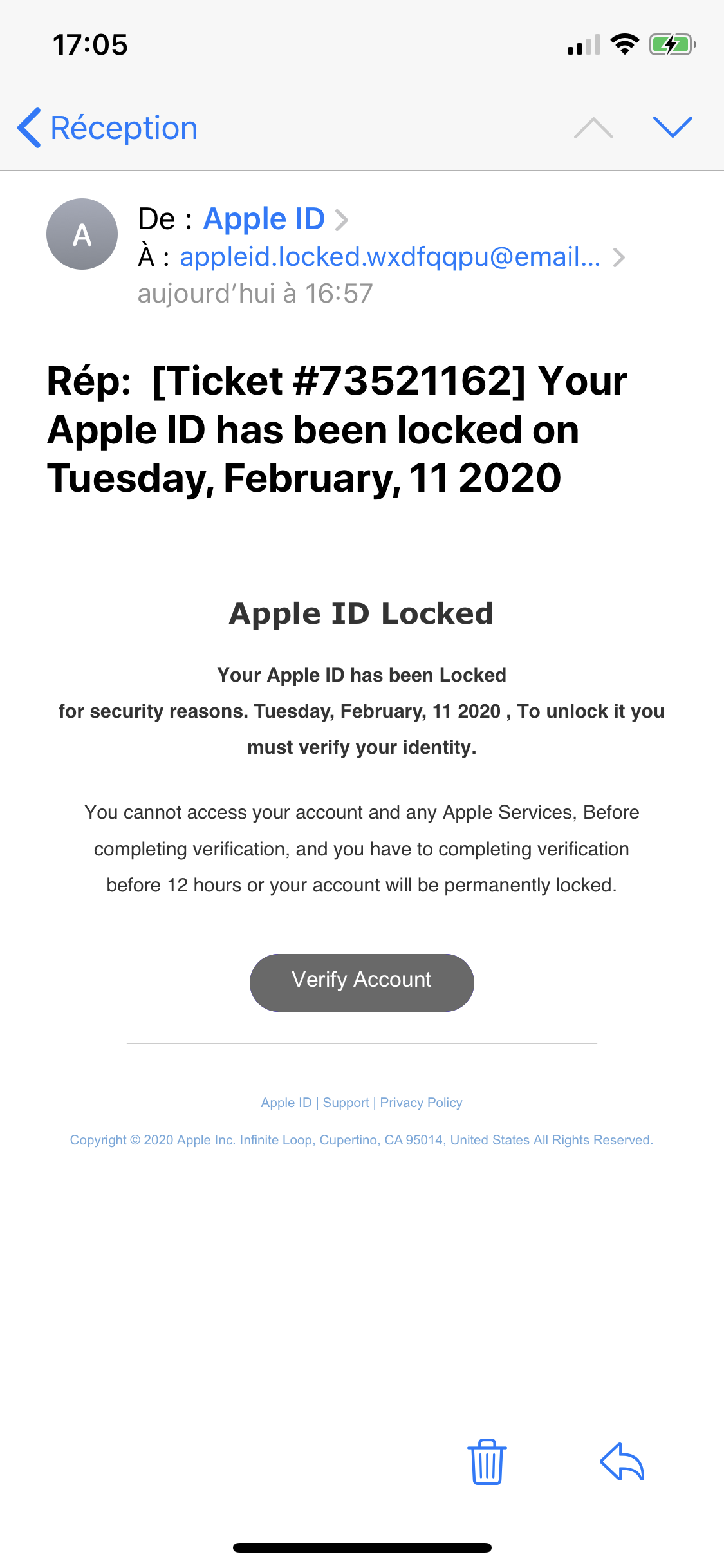 bonjour j’ai reçu un mail qui me dit que mon compte apple est bloque et que je dois rentrer toutes mes informations “adresse / carte bancaire ... si je ne le fais pas sous 12h ça me bloque pour toujours mon compte. Voici l’adresse du lien. est ce vrai ou une arnaque ? Bonne jour de https://appleid.apple.com.dikaladiamsajana.com/account/?view=update&appIdKey=0dc9e6d57b50fd5&country=FR