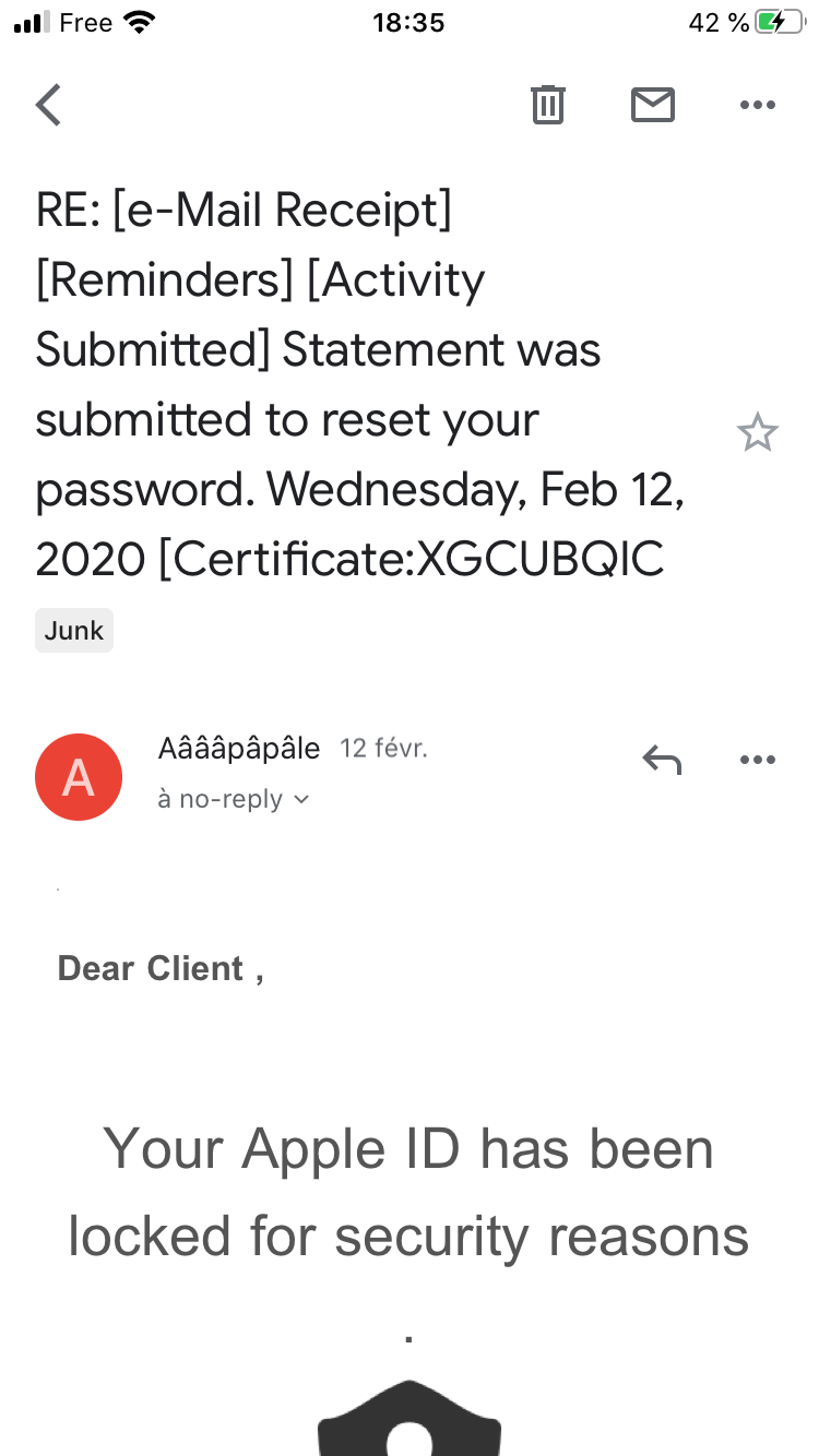 Bonjour, j’ai reçu le 12 février un mail me disant que mon Apple ID a été bloqué pour des raisons de sécurité car une connexion non autorisée a été détectée, le mail me demande de cliquer sur un lien pour déverrouiller mon compte. Je voulais savoir si ce mail et vrai ou pas, merci de votre réponse. [Titre Modifié par l’Hôte]