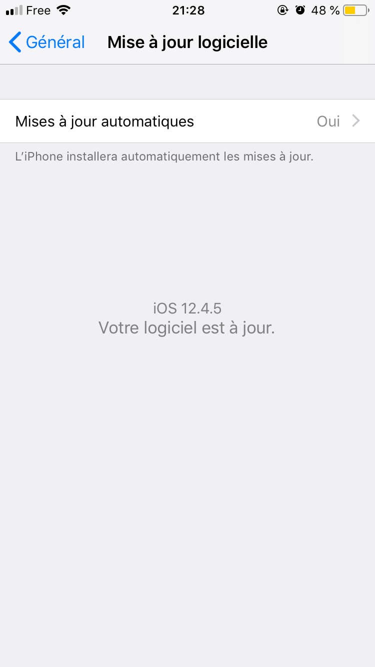 Bonjour, mon iphone est à IOS 12.4. Je voudrais le mettre à jour au 13 depuis la sortie de la mise à jour mais mon appareil indique qu’il est à jour. Comment l’installer(sachant que j’ai largement assez de place) ?
