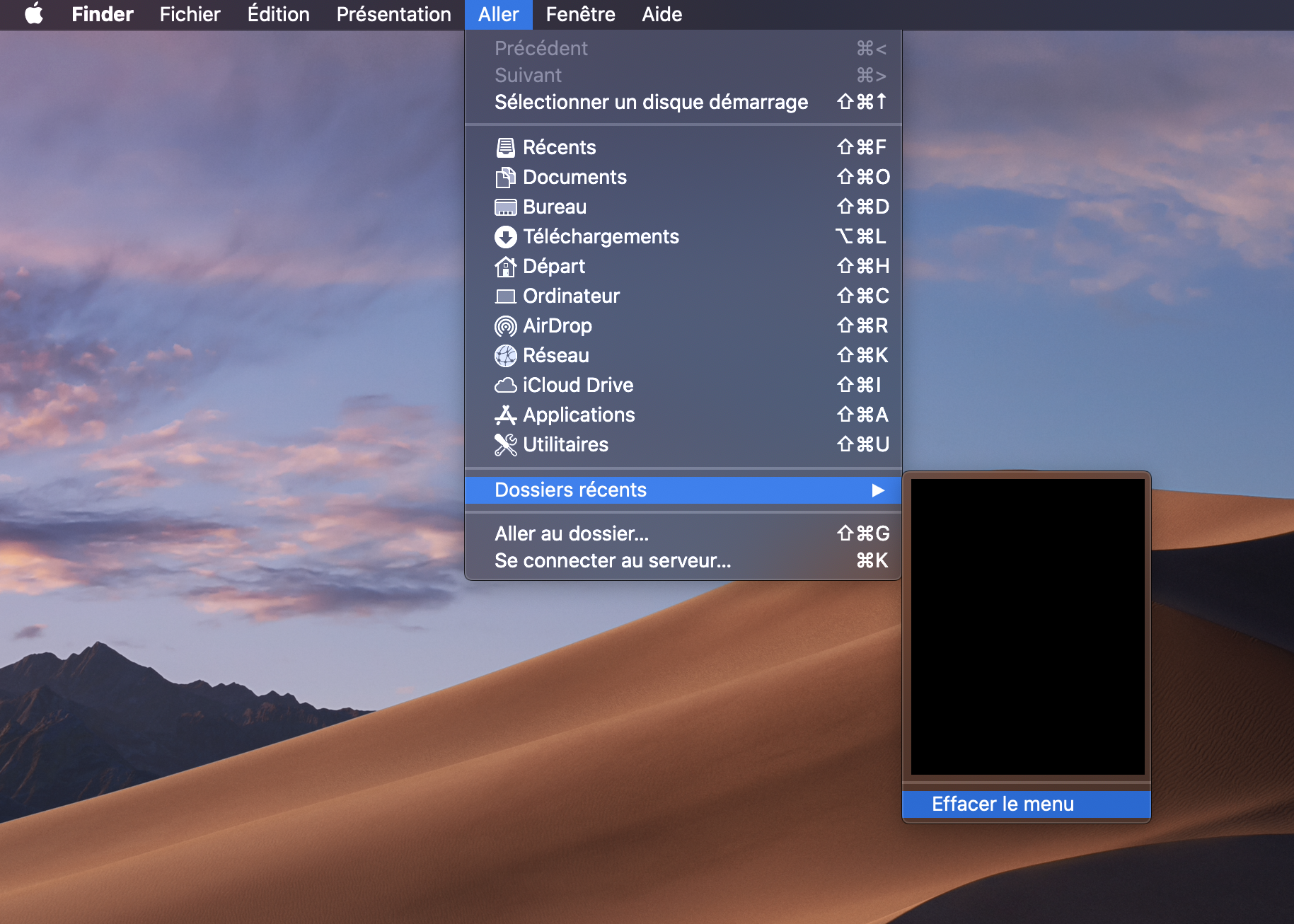 Pour cela, il faut cliquer sur son bureau, aller dans la barre de menu, cliquer sur Aller, puis Dossier Récent, et tout en bas, il y a une option pour effacer la liste de dossiers récents !