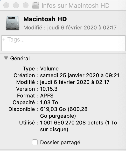 Il me semble incohérent de voir une acapcité de 1 To, une disponibilité 619 Go ( je ne comprends pas l'histoire du purgeage au passage), et le fait que plus de 1 To soit indiqué comme déjà utilisé.