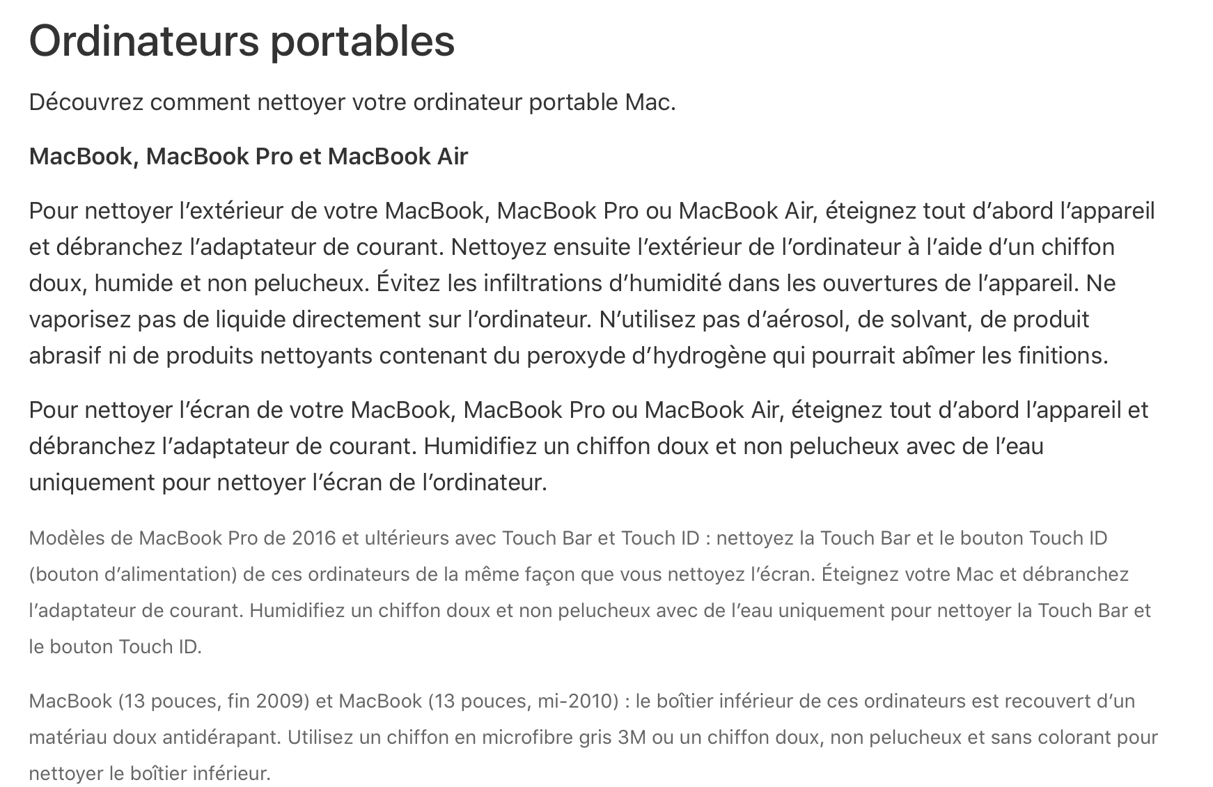 Il existe plusieurs pages sur le site de l'assistance qui expliquent comment procéder. Il est recommandé d'utiliser de l'air comprimé pour nettoyer entre les touches sans endommager le clavier. Pour le reste, tu peux utiliser un chiffon doux, humide, non pelucheux.