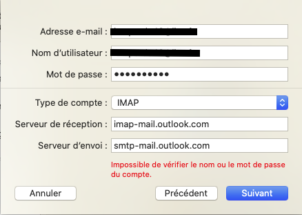 Bonjour, j'aurais voulu configurer mon adresse Mail hotmail sur l'app Mail d'Apple, sauf qu'au moment de fin de configuration, il n'y à pas de possibilité d'ajout, une erreur apparait :