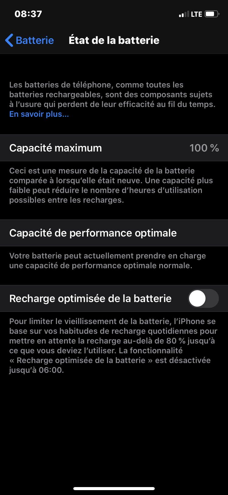 j’ai décoché l’option dans « batterie » qui s’appelle charge optimale et qui permet à Apple de faire charger selon l’habitude de l’utilisateur mais rien n’y fait je ne dépasse plus les 80 et 90%