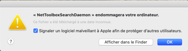 J'ai donc cherché dans le finder un document portant le nom "NetToolboxSearchDaemon", je l'ai trouvé et supprimé et vidé la corbeille. Seulement, j'ai beau cliqué sur la touche ok, afficher dans le finder ou décocher la touche signaler un logiciel... Cela n'y fait rien le message réapparait quelques secondes après.