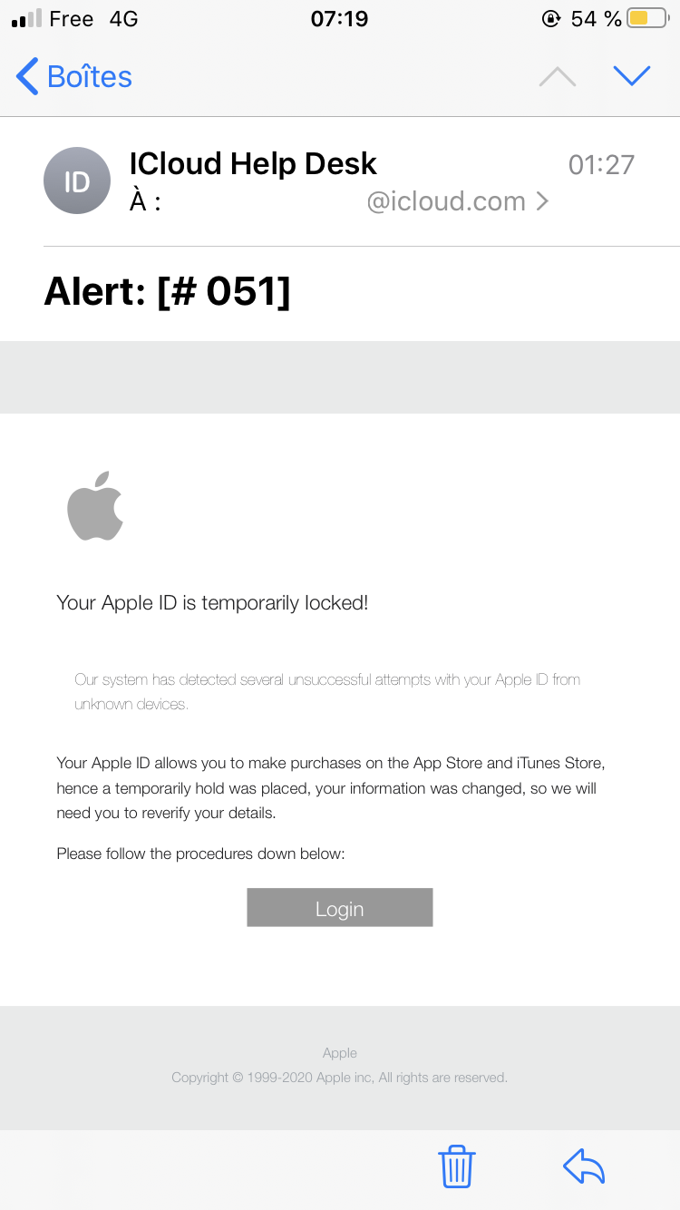 Par expérience, cela ressemble bel et bien à un e-mail d'hameçonnage. Les e-mails envoyés par Apple concernant les identifiants Apple ne ressemblent pas à ça. Si vous voulez en avoir le cœur net, cliquez sur "iCloud Help Desk" en haut du courrier électronique et vous devriez remarquer que l'adresse ne ressemble pas à une adresse Apple. Regardez la partie : "Si vous recevez un e-mail ou un message suspect" car c'est celle qui va correspondre à votre souci.