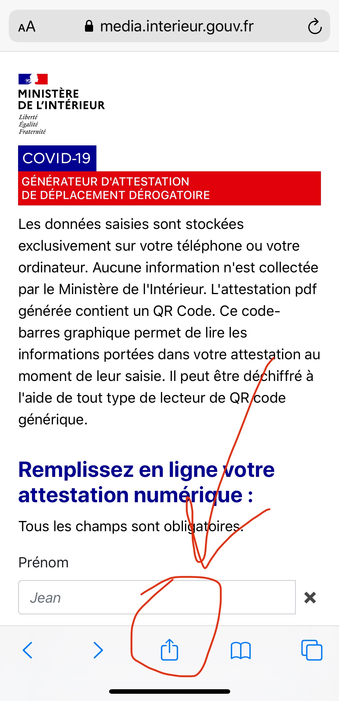 Lorsque tu as généré ton attestation et qu’elle est apparue sous forme de document PDF dans Safari, tapotes l’icône que tu peux voir ici :