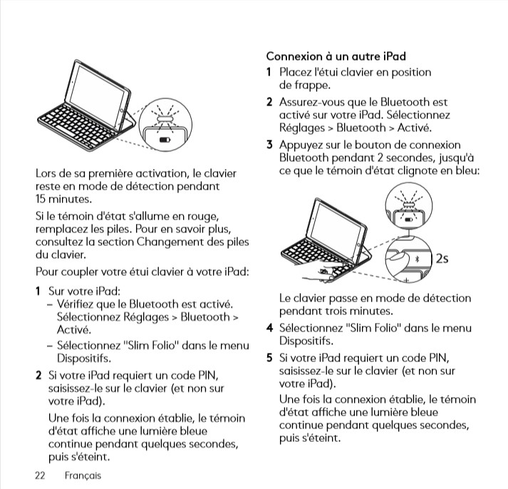 Puis éteignez votre iPad retirez les piles du folio, patientez quelques minutes, rallumez votre iPad, remettez les piles dans votre folio, attention de les remettre du bon côté. Puis refaites le jumelage de votre Folio :