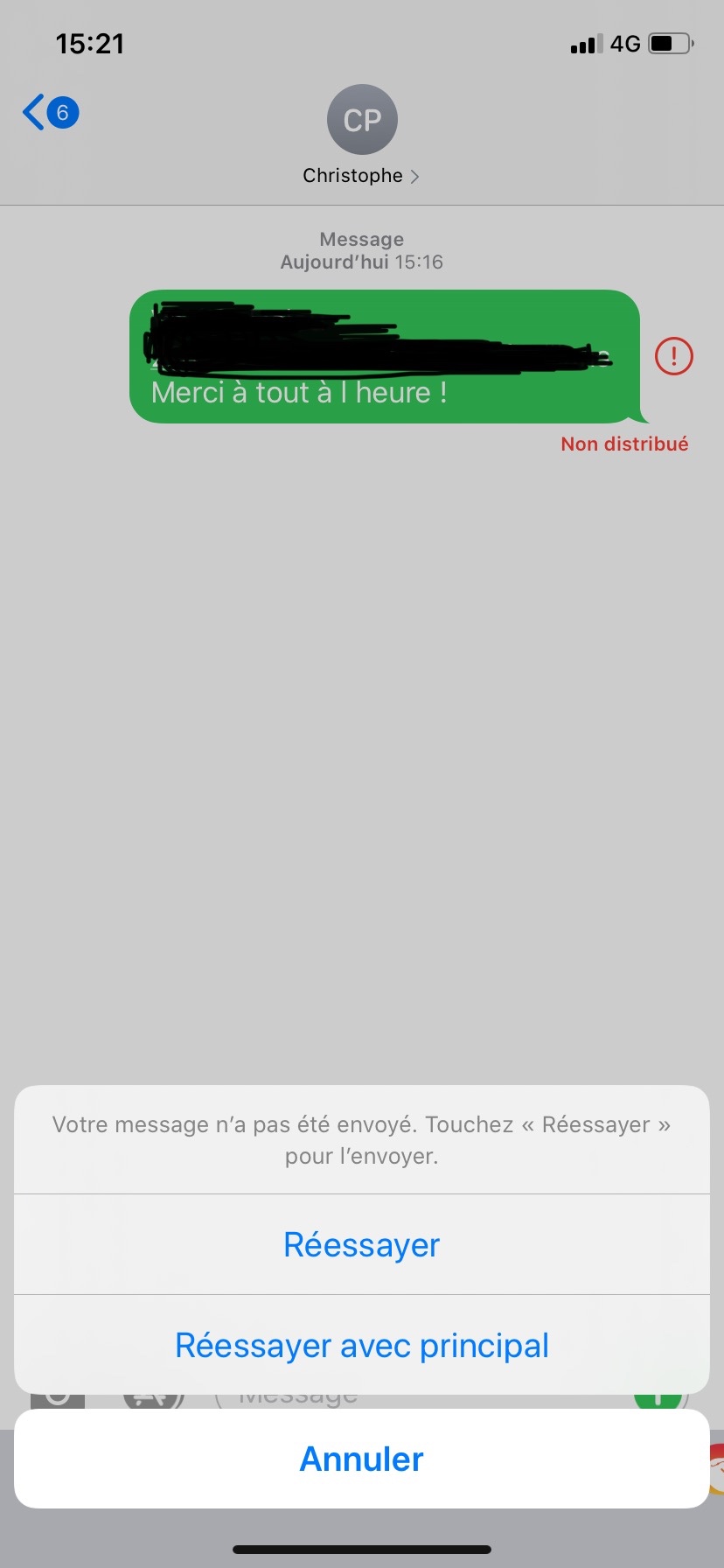 Bonjour j’ai tjs le même problème sur l’iPhone 11 de ma compagne ( modèle us acheté à New York en novembre ) lorsqu’elle envoit un sms à une personne qui ne dispose pas d’un appareil iOS, le message essaie de partir pendant cinq minutes et ensuite un message erreur apparaît et il faut faire la manipulation réessayer avec principal pour que le message parte bien ( cf photos ) pouvez vous m’aider ? A l’intérieur il y a bien une nano SIM et pas d esim active sur le téléphone. Sur son ancien iphone avec le même opérateur aucun problème merci d’avance pr votre aide